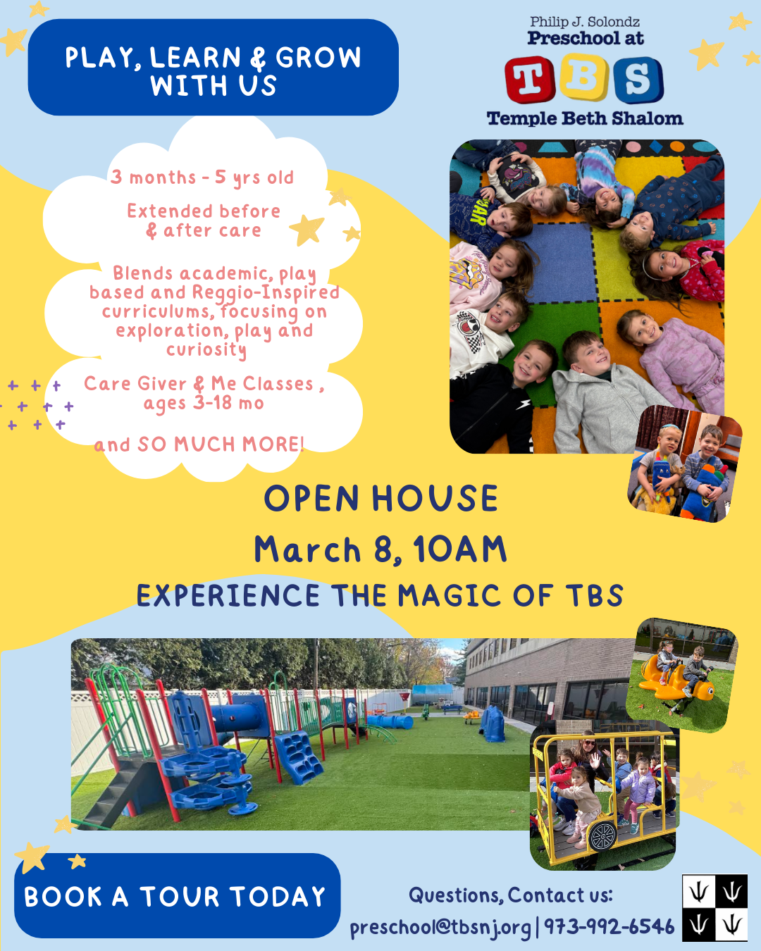 Play, Learn & Grow with Us. Experience the Magic of TBS Preschool! Open House on March 8 , 2026 at 10am. 3 months – 5 yrs old. Engaging enrichment, fun and much more!